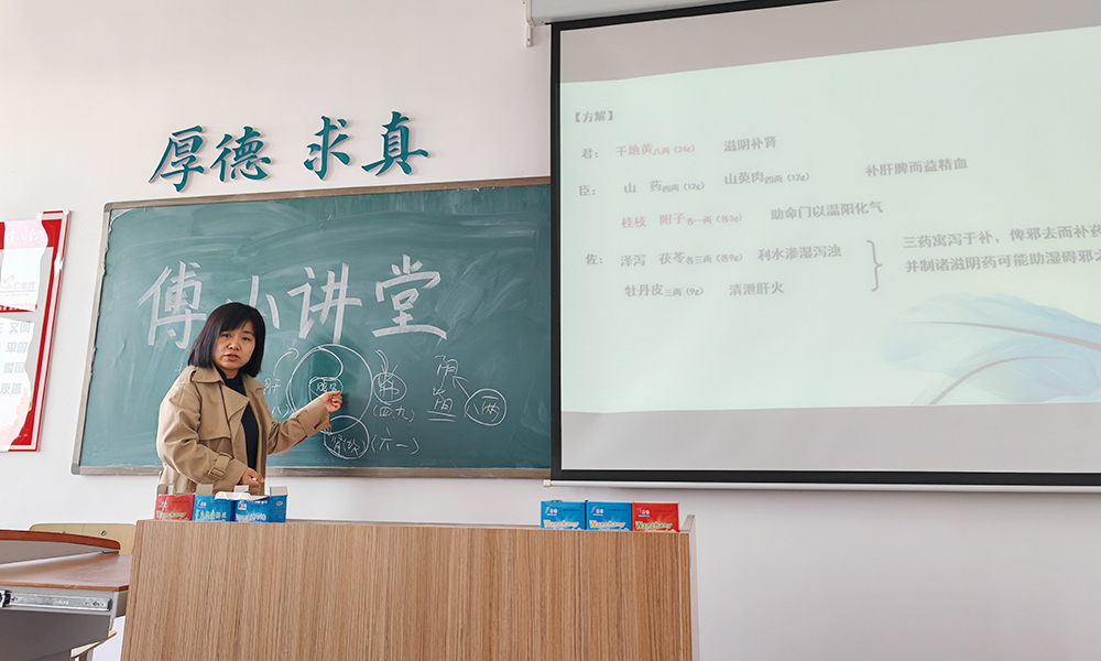 冯玉华从药量和药味的增减变化与方剂配伍原则入手,以小承气汤与厚朴三物汤、麻黄汤与麻杏石甘汤两组方剂为例,深入浅出地阐述了“论方者,君效也。君效者,方之精也。堂方之精,变也。是谓方无至方,方以效论。”的君臣佐使配伍观点。还结合临床实际,以肾气丸为例,从阴阳五行理论出发,详细解析了其治疗肾阳不足所致痰饮、水肿、消渴等水液代谢失常的组方机理,从君药、臣药、佐药分析印证了方无至方,方以效论的辨证思想,为同学们理解中医方剂学的动态平衡观提供了启示。用方如用将,用药如用兵,她鼓励同学们将经典理论与临床实践紧密结合,深入了解每一味中药,在辨证立法的基础上选择合适的药物组成方,发挥药物的所长,达到“增效减毒”之功效。