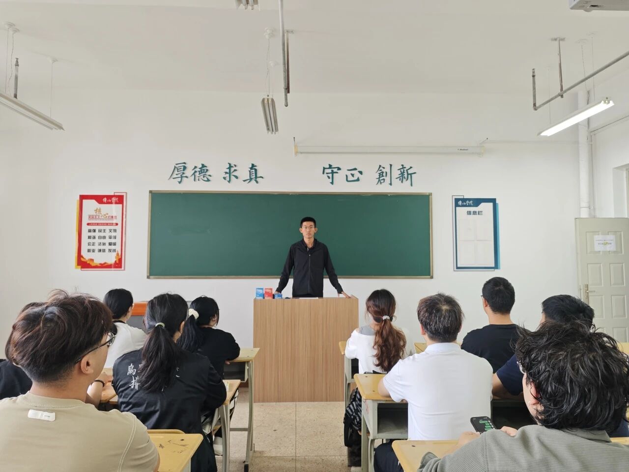 在学习方面,辅导员详细介绍了综测的相关内容,包括评分标准、评定流程以及其在评奖评优中的关键作用,并对上一学年的评奖评优情况进行了总结回顾,鼓励同学们向优秀榜样学习,努力提升自己的学业成绩。