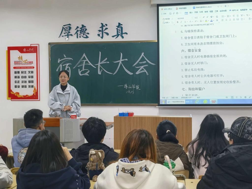会上,张予婷首先围绕新规修订的核心初衷展开说明。她强调,此次宿舍规定修订紧扣校园生活新需求,既是为了为同学们打造更安全、舒适、有序的居住环境,更是通过明确管理标准,引导大家养成良好生活习惯、提升自主管理能力。随后,她针对新规重点内容进行细致解读,覆盖宿舍卫生、用电安全、公共区域使用及访客管理四大核心板块——明确每周固定大扫除频次与卫生达标要求,细化违规电器界定与安全用电规范,厘清公共区域使用权责与秩序维护细则,让管理标准更清晰、执行边界更明确。